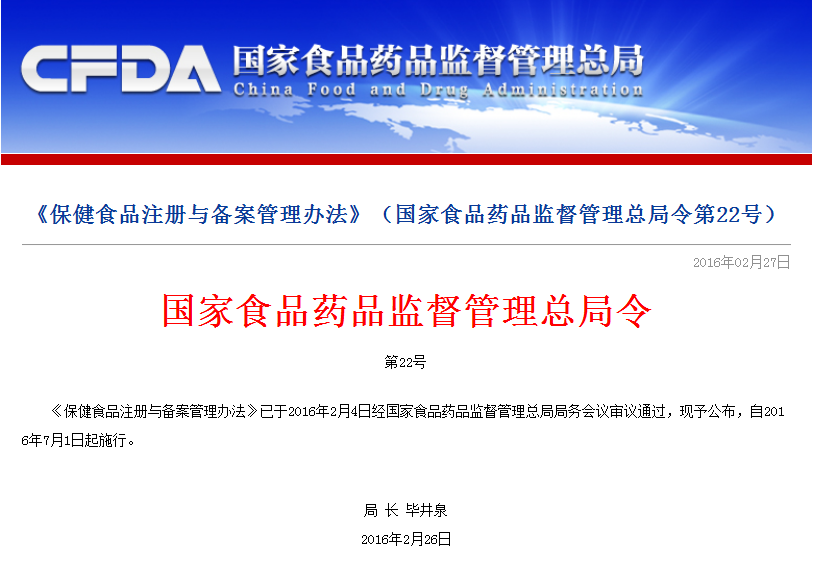 《保健食品注册与备案管理办法》(国家食品药品监督管理总局令第22号)